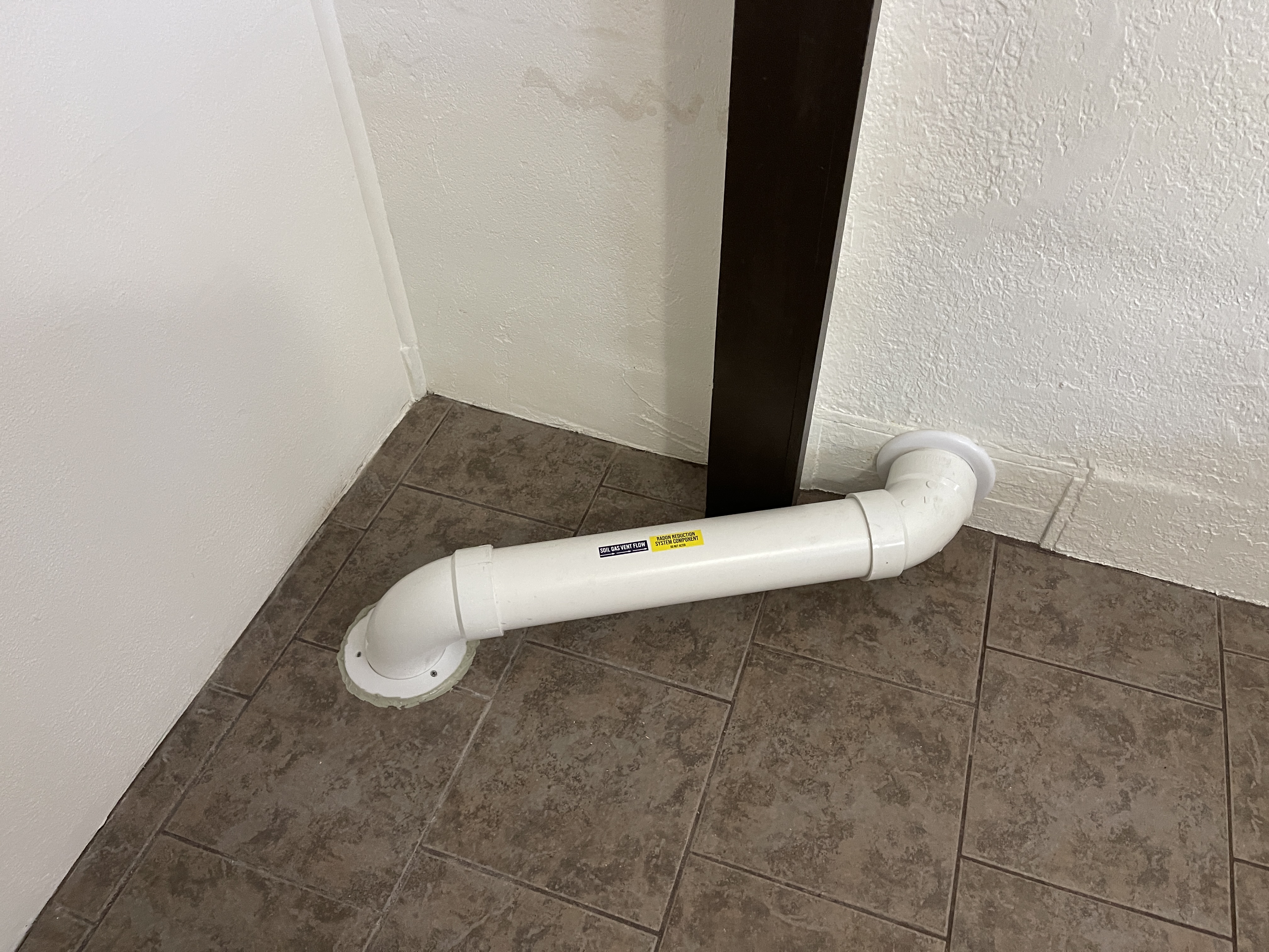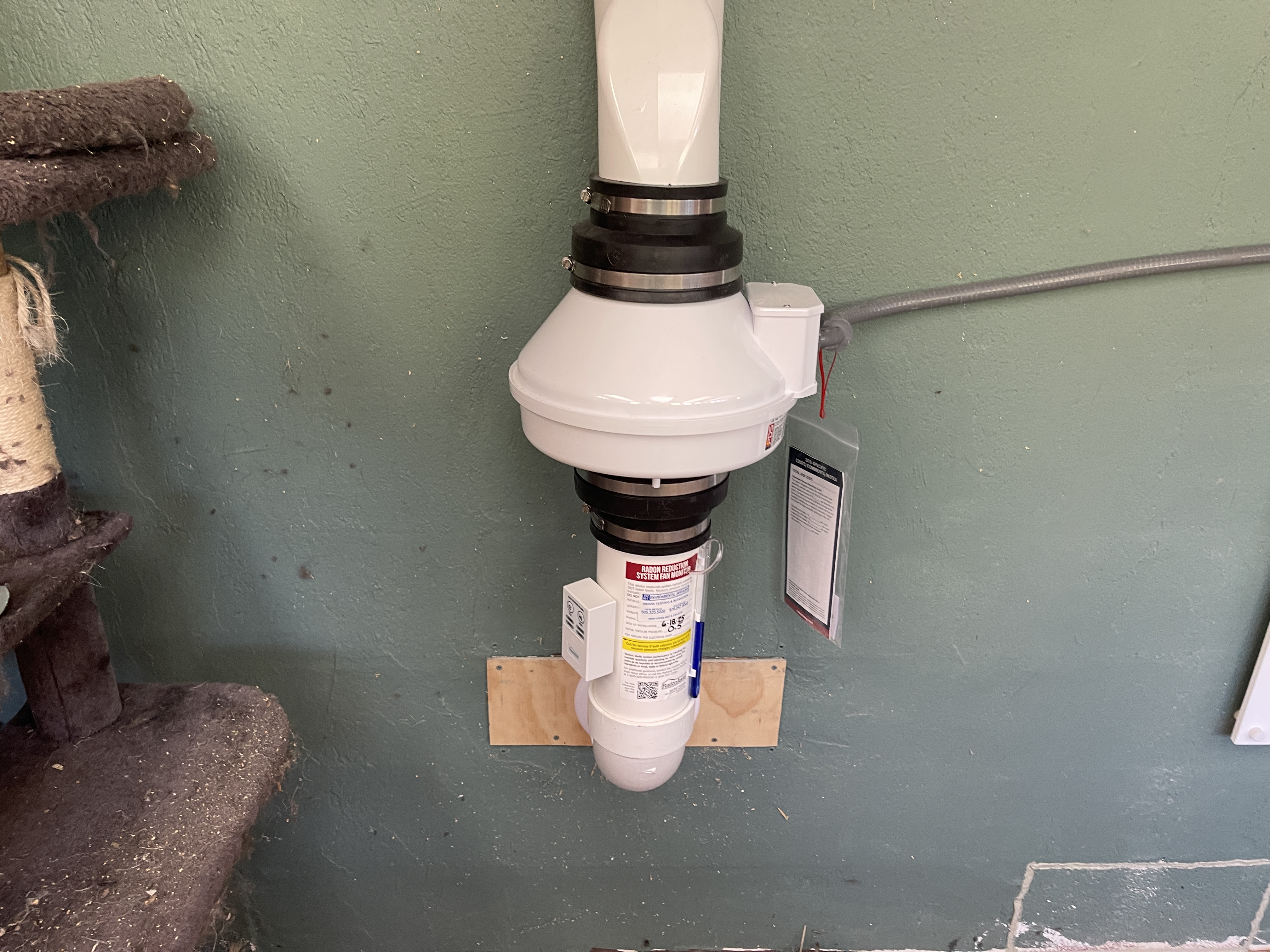 At this property in Cortez, Colorado, elevated results from a professional radon inspection and radon test indicated the need for an engineered Active Sub-Slab Depressurization (ASD) system. Due to the length and layout of the home, it was initially anticipated that two separate radon mitigation systems might be required to effectively reduce indoor radon levels. Our team installed a primary sub-slab suction point within a bedroom closet, carefully routing the mitigation piping up into an exterior storage room and venting safely through the storage room roof to discharge radon gas above the home in accordance with EPA radon mitigation standards. During installation, we drilled through the concrete slab and discovered large rock fill beneath the foundation — part of a passive solar heating design — which actually enhanced sub-slab air movement and depressurization efficiency. Post-mitigation radon testing confirmed that the single ASD system successfully reduced radon concentrations throughout the entire home, eliminating the need for a second penetration and providing long-term indoor air quality protection for this Cortez, CO residence.